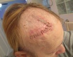 The stitching up process was horrifying. The doc and his assistant surrounded me and both were attaching sutures. They must have woven them together, because when they completed a layer of stitches, they pulled them, causing them to stretch the layers of skin together. This hurts like a Mother, BTW. The topical numbing stuff was long worn off at this point of the surgery. As they pulled together layers of my scalp, they needed to lean on me to get the leverage needed for pulling everything in place. Then they “put a ‘million’ little staples” on the outside,, according to Hubby.