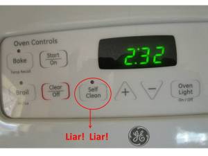 If you don’t know about self-cleaning ovens, let me educate you. First off, the oven does not really clean anything. YourSELF and mySELF do all the preparation: washing oven door, removing the bottom drawer (with pots and pans in it) away from the oven, and removing the oven racks.) The racks must be scrubbed by yourSELF. All the parts that sit on top of the oven (stove pieces) must also be cleaned by yourSELF. Well, you ask, what does the oven do? The oven heats up to 550 degress Farenheight. Stays on for 4 hours at that temp, then the cycle is over. A more accurate description – the oven burns up the grime in itself and turns it to ash.