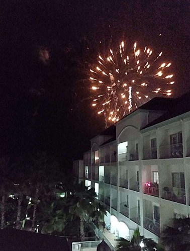 We waited for midnite watching movies in our pajamas and tucked into bed. Not a glamorous way to greet the new year, but cozy and warm. And together. We were not expecting to see the fireworks planned for further down the island, closer to the bridge to the mainland. It must have been the force of the wind, but we had a front-row seat on our balcony. Maggie got some photos and shared them.