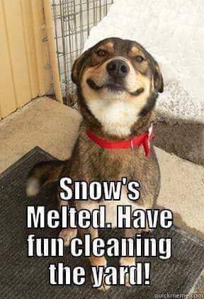 When snow covers the ground, and it starts melting, you can see poo underneath. It is still frozen. This is the easiest to scoop up. Frozen snow doesn’t stink either. Which can be a big bonus.